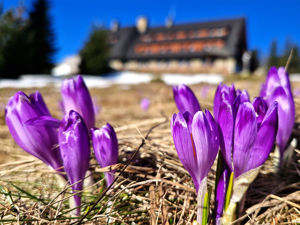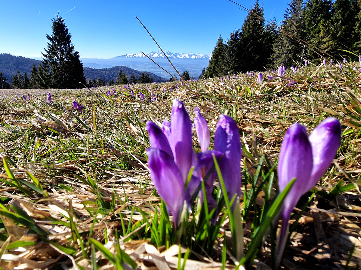 Poniżej schroniska, na łące rozpościerał się kobierzec fioletowych krokusów. Nie kilka sztuk jak spotykałam poprzednio, ale cała łąka. Sprawiło to, że pierwszy kilometr szliśmy ponad godzinę, bo co kilka metrów trzeba było się zatrzymać na zdjęcie, filmik. Nie dało się przejść koło tego obojętnie. Warunki były wspaniałe, niebo bezchmurne, w tle ośnieżone Tatry i jeszcze po drodze ławeczka ,żeby tę panoramę Tatr podziwiać. Jako, że czas nam się kurczył, podziwianie ograniczyło się do 2 minut.