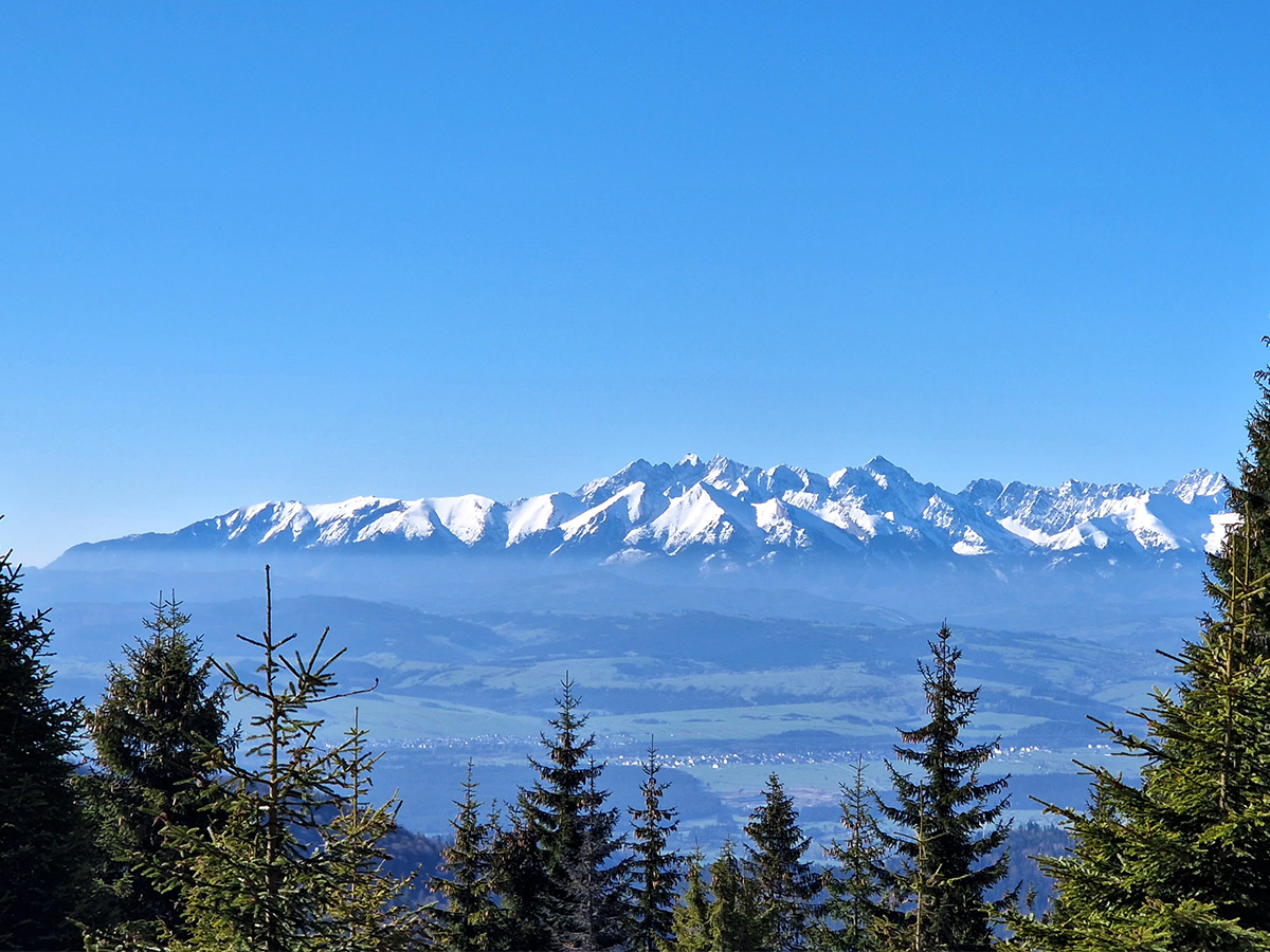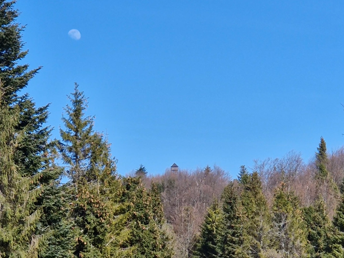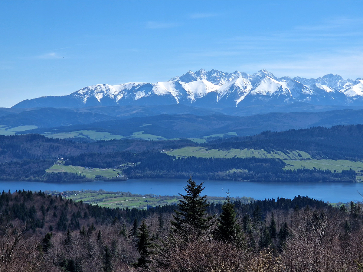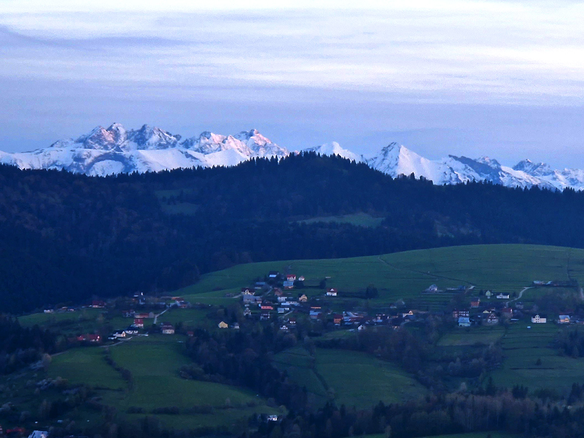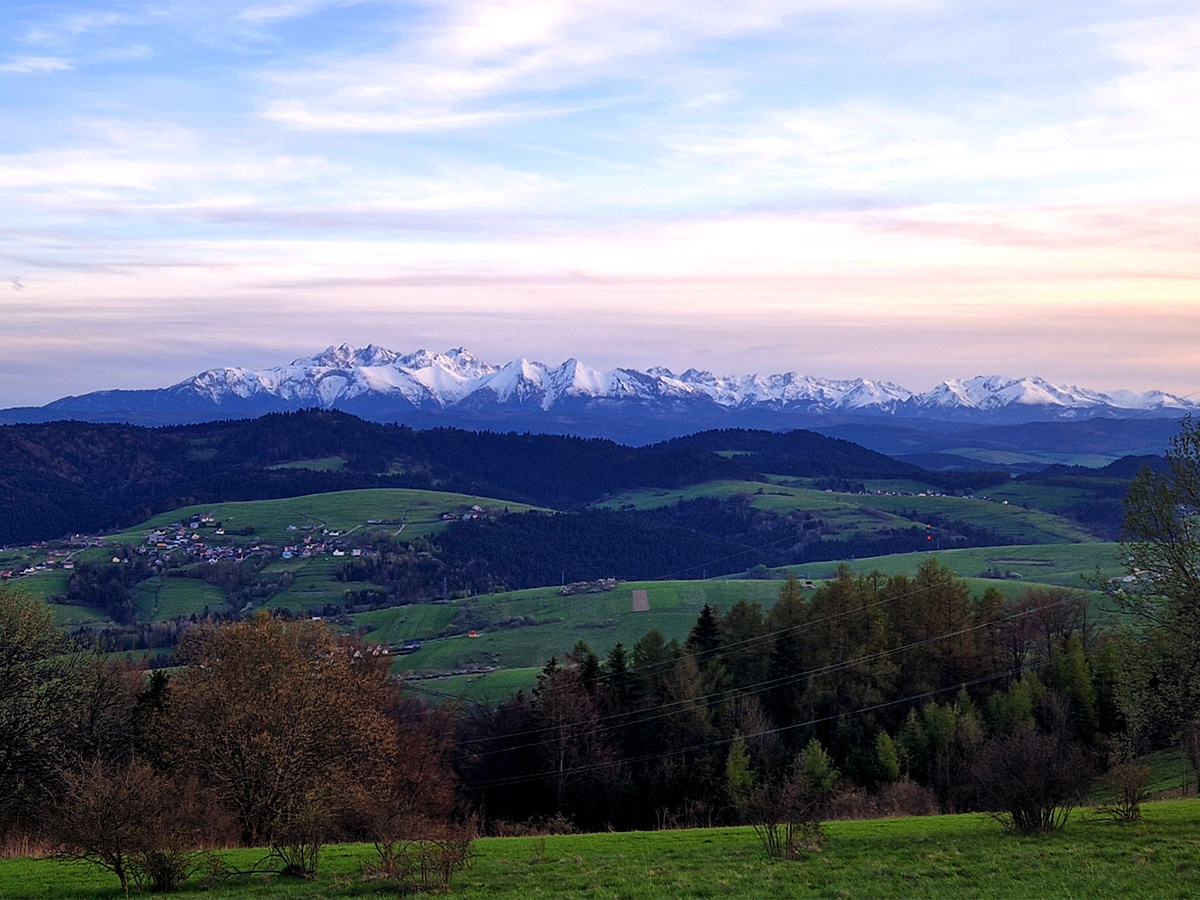 W Źródełku Miłości napełniliśmy butelki na wodę. Słońce grzało coraz mocniej, po porannym chłodzie nie było już ani śladu. Można wędrować w krótkim rękawku. Na punkcie widokowym spotkaliśmy pierwszych tego dnia ludzi. Schodzą do Przełęczy Knurowskiej mijaliśmy ich już sporo. Pytali po drodze, czy na górze są krokusy. Trafiliśmy też na jakiś Majówkowy festyn, ale nie zainteresowało nas to na tyle, by się zatrzymać. Przekraczając szosę Gorczańską zostaliśmy sami. Wszyscy udawali się na Turbacz, a ja byłam zadowolona, że mamy te tłumy za sobą. Kierowaliśmy się w stronę Lubania po drodze co chwile odwracając głowę w prawo, bo podziwiać Tatry i Jezioro Czorsztyńskie, które zbliżały się do nas, a raczej my do nich coraz bardziej. Dziś jest chyba najcieplejszy dzień na trasie od mojego startu w Ustroniu. Piękna Majówka. Pokazał się nawet Księżyc.