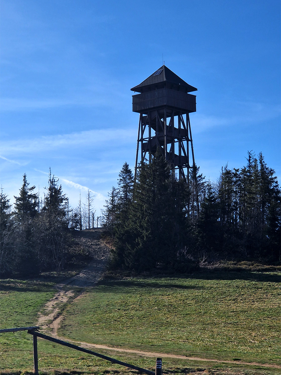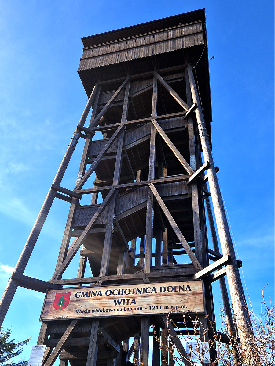Z daleka ponad drzewami ukazała się wieża na Lubaniu. Wydaje się już tak blisko, ale widać, że czeka nas niemałe podejście. Ostatnie metry są wyczerpujące, jest bardzo stromo, ale nagroda w postaci widoków sprawia, że zmęczenie poszło w niepamięć, chociaż trzeba odpocząć na ławce zanim pokona się schody na wieżę. Na wieży oprócz oszałamiającego widoku 360 stopni znajduje się też pieczątka i mapa widocznych szczytów.