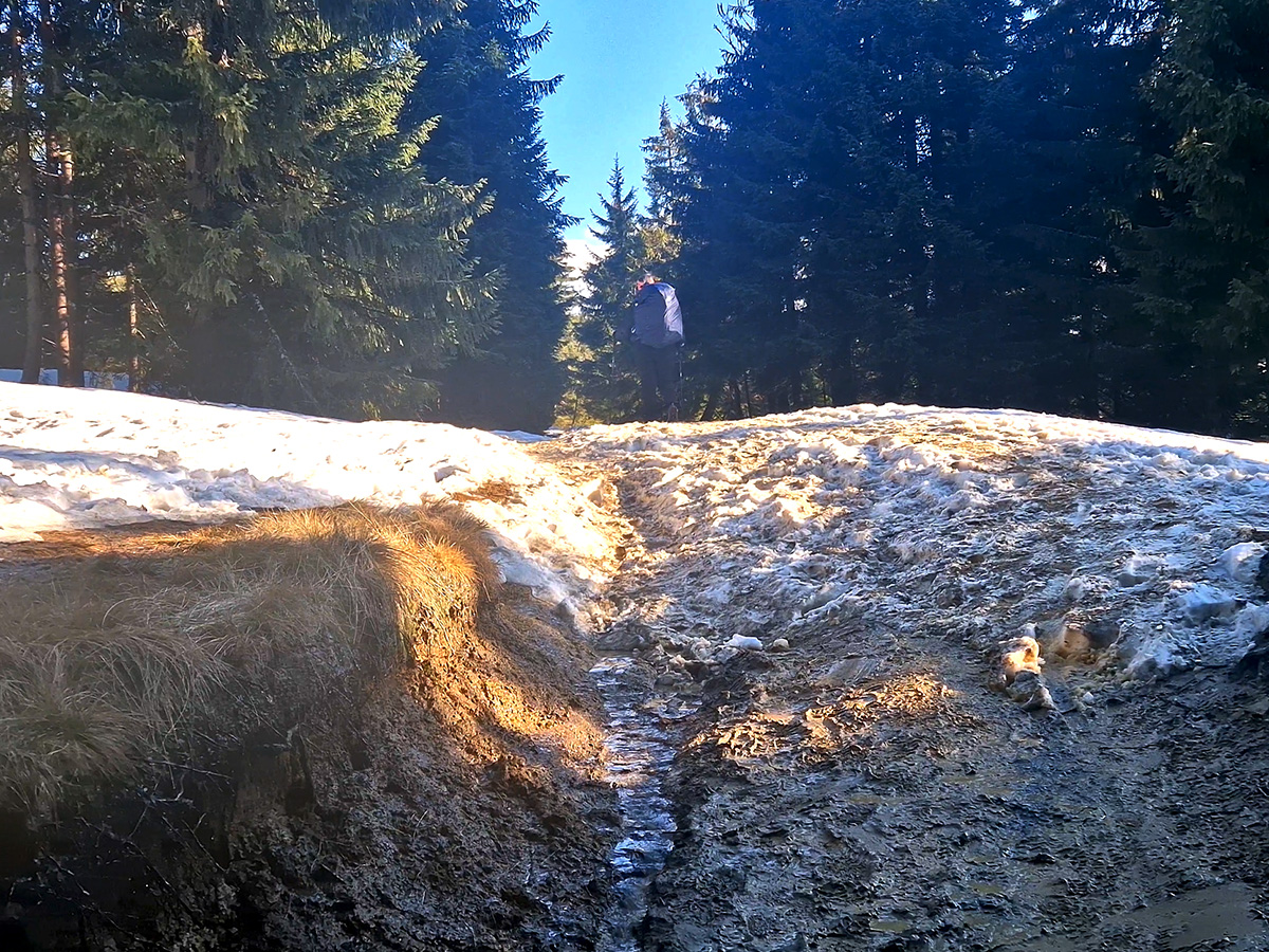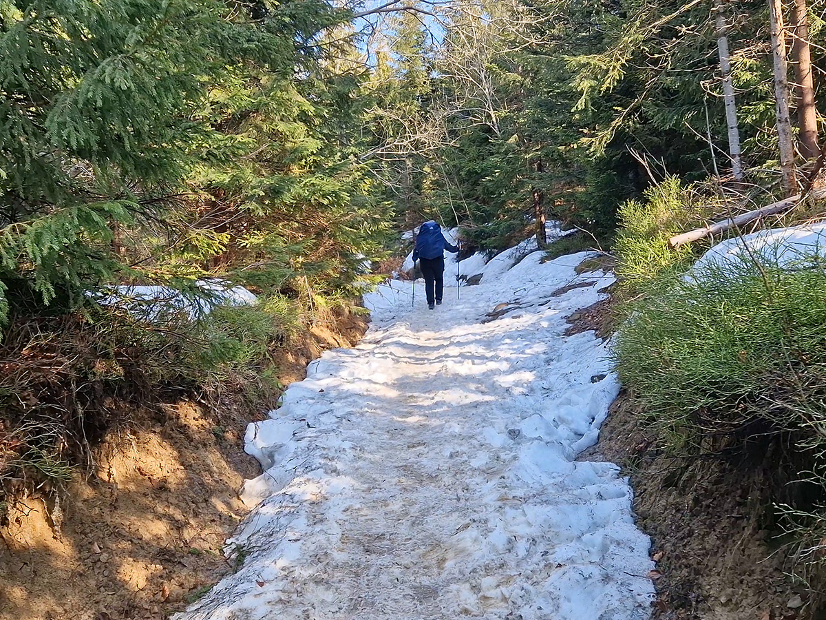 Wędrujemy dalej, ludzi na czerwonym szlaku jest już znacznie mniej. Mijamy Obidowiec i kierujemy się na szczyt Turbacza. Im wyżej się wznosimy tym więcej pojawia się zalegającego śniegu, a ścieżka zamienia się w rzekę z wodospadami. Trzeba bardzo uważać gdzie postawi się stopę. Kiedy po raz kolejny zapadła mi się ona w śnieg, pod którym była woda, było mi już wszystko jedno i tak przemoczyłam stopy.