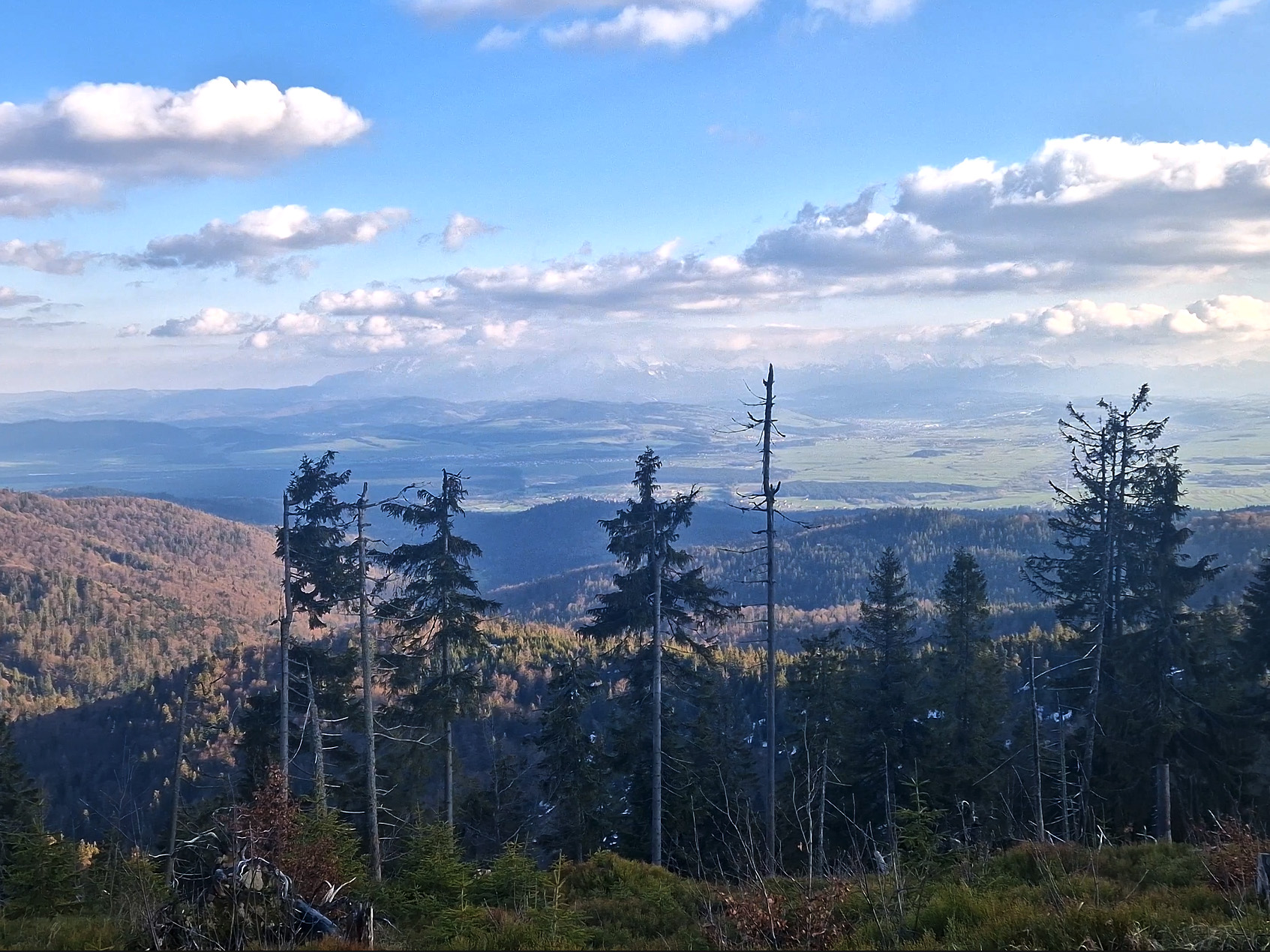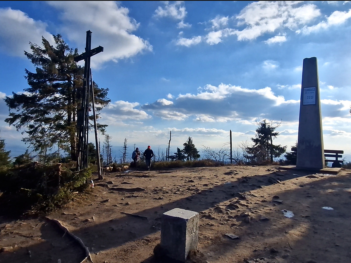 Zdobywamy szczyt Turbacza i podziwiając panoramę z lekkim zarysem Tatr zmierzamy do schroniska. Kontrast pogodowy do tego co było rano jest ogromny.