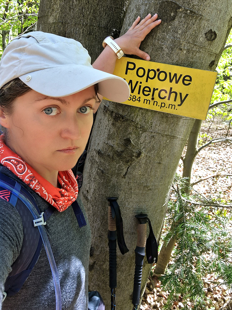 Nabrawszy energii po tym krótkim odpoczynku ruszam w drogę. Wspinam się na Popowe Wierchy (684 m. n.p.m. ) Obejrzałam się za siebie i po przeciwnej stronie drogi na wzgórzu dostrzegłam zbiegłe krowy. Pasły się kilka pól od swojego miejsca. Znów wkraczam w las, w którym jest przyjemnie chłodniej bo na otwartej przestrzeni słońce daje już nieźle w kość, bo nie ma wiatru. Szlak oznakowany jest bardzo gęsto, niemal co drugie drzewo, a tak przestrzegano przed zgubieniem go 😉