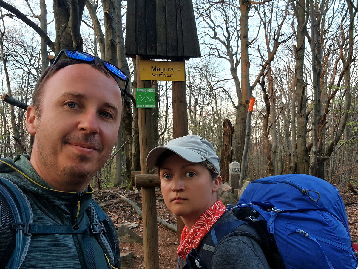 Opuściłam Bacówkę i maszerowałam dalej polna drogą rozjeżdżoną przez traktory. W pewnym momencie przez chwile nieuwagi utopiłam but w gęstym błocie. Ledwo go wyciągałam pozostając w skarpetce. Nie przypominał już buta i ważył tonę. Przykucnęłam nad kałużą i próbowałam go wykąpać. W tym momencie spojrzałam za siebie i ujrzałam niebieski odblask okularów przeciwsłonecznych. Byłam pewna już, że to Marek zmierza w moim kierunku, bo chociaż przez brak zasięgu nie mogliśmy się porozumieć, czasowo powinniśmy spotkać się właśnie w tych okolicach. Nie myliłam się. Ruszyliśmy razem w stronę Magury (829m.n.p.m.). Miejsca, które już oboje znamy z poprzednich wycieczek. Udaliśmy się na nocleg kiedy słonce chyliło się ku zachodowi.